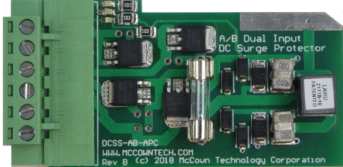 DC dual input powerline surge suppressor – protector. Combines and protects inputs and output separately. Lumped inductance between input and output shunts surges coming from either direction to ground while impeding their flow to the other side of the device. Both semiconductor surge suppression and Gas Discharge Tube for fast and large surge protection. Double Multi-Stage protection devices provide 4 X the protection of conventional protection devices.